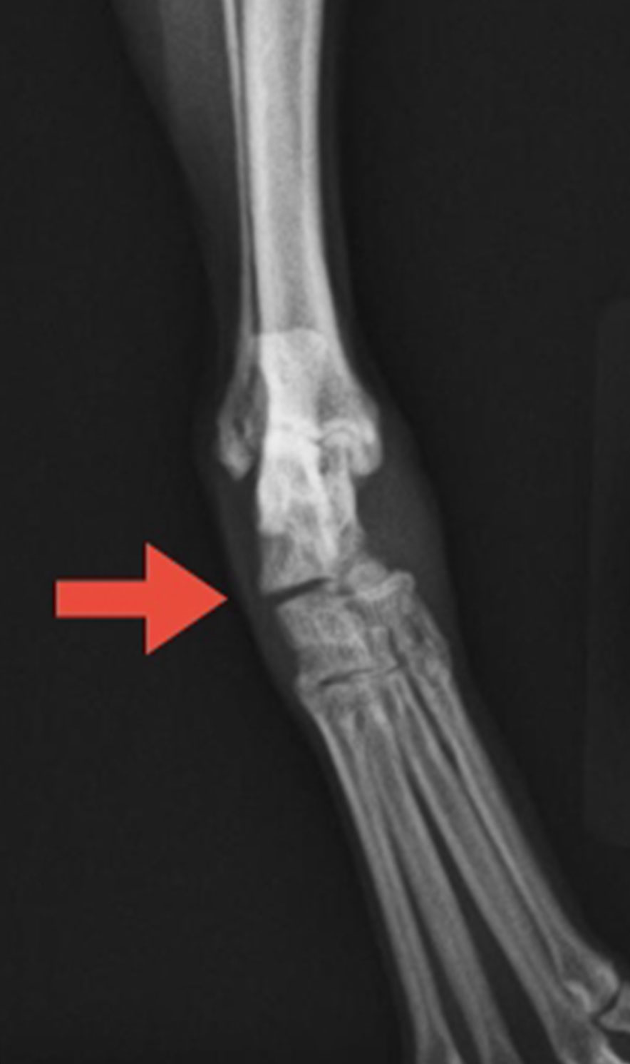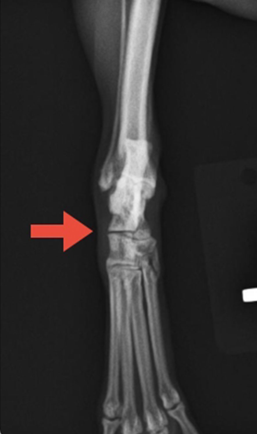 前肢の中手骨(手の甲の骨)を3本骨折した症例です。