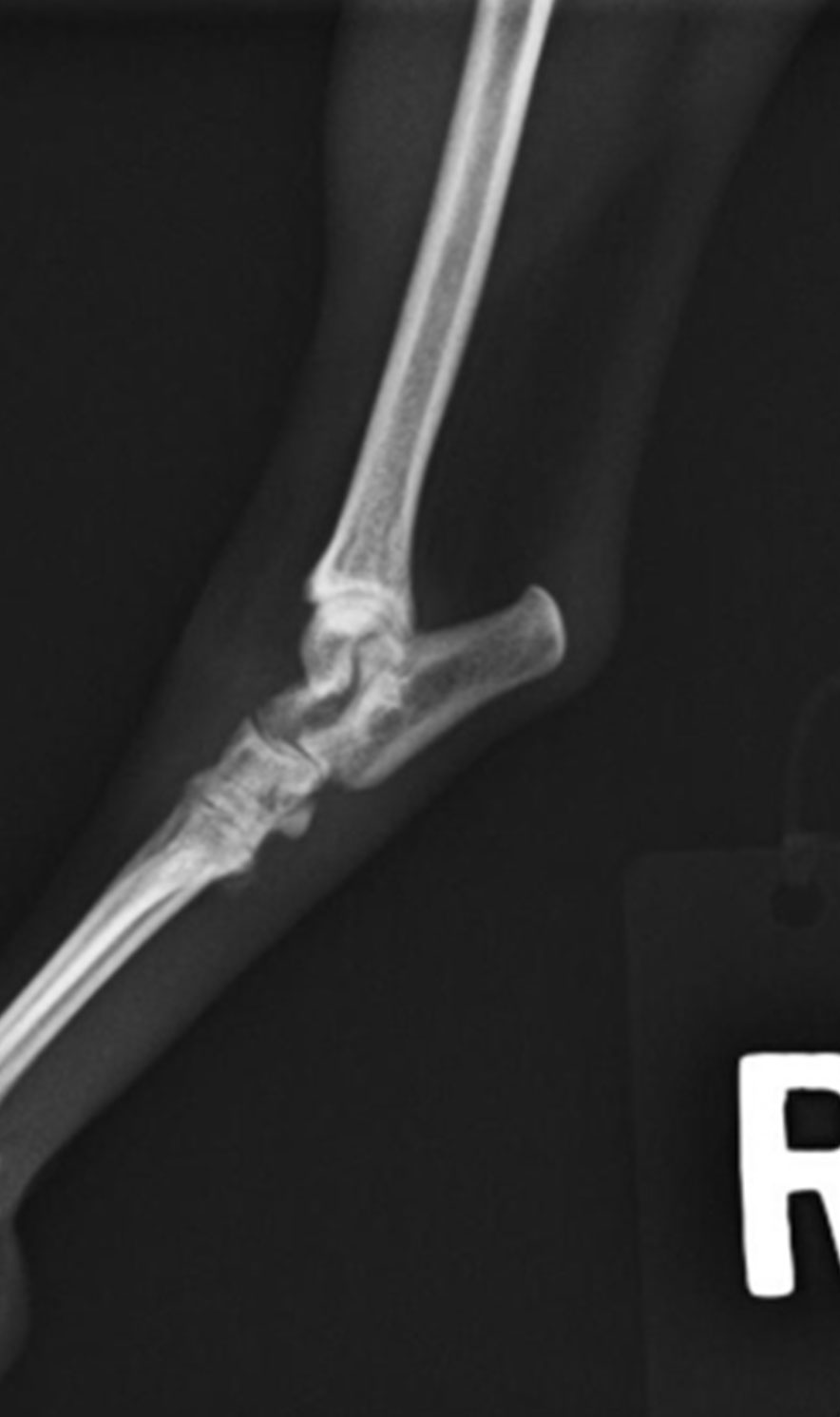 骨折部のズレがなかったり、骨がすぐにくっつきそうな場合には外固定(保護)で治療する場合もありますが、多くの症例では全身麻酔下での手術が必要になります。小型犬の前肢骨折(橈骨・尺骨の骨折)は骨の端で起こりやすく、手術による固定が困難であったり、骨折部位の周囲に筋肉や血流が乏しく、骨の治りが悪いこともあります。しっかりと骨癒合が得られる(骨がくっつく)ように、骨折の部位や折れ方、症例の年齢や気質を考慮し最適な治療法を選択し、手術を行います。