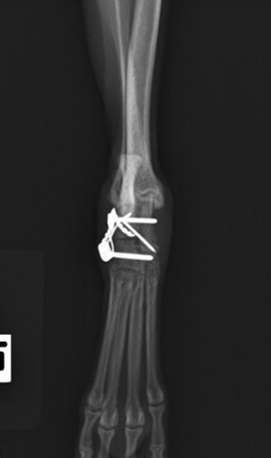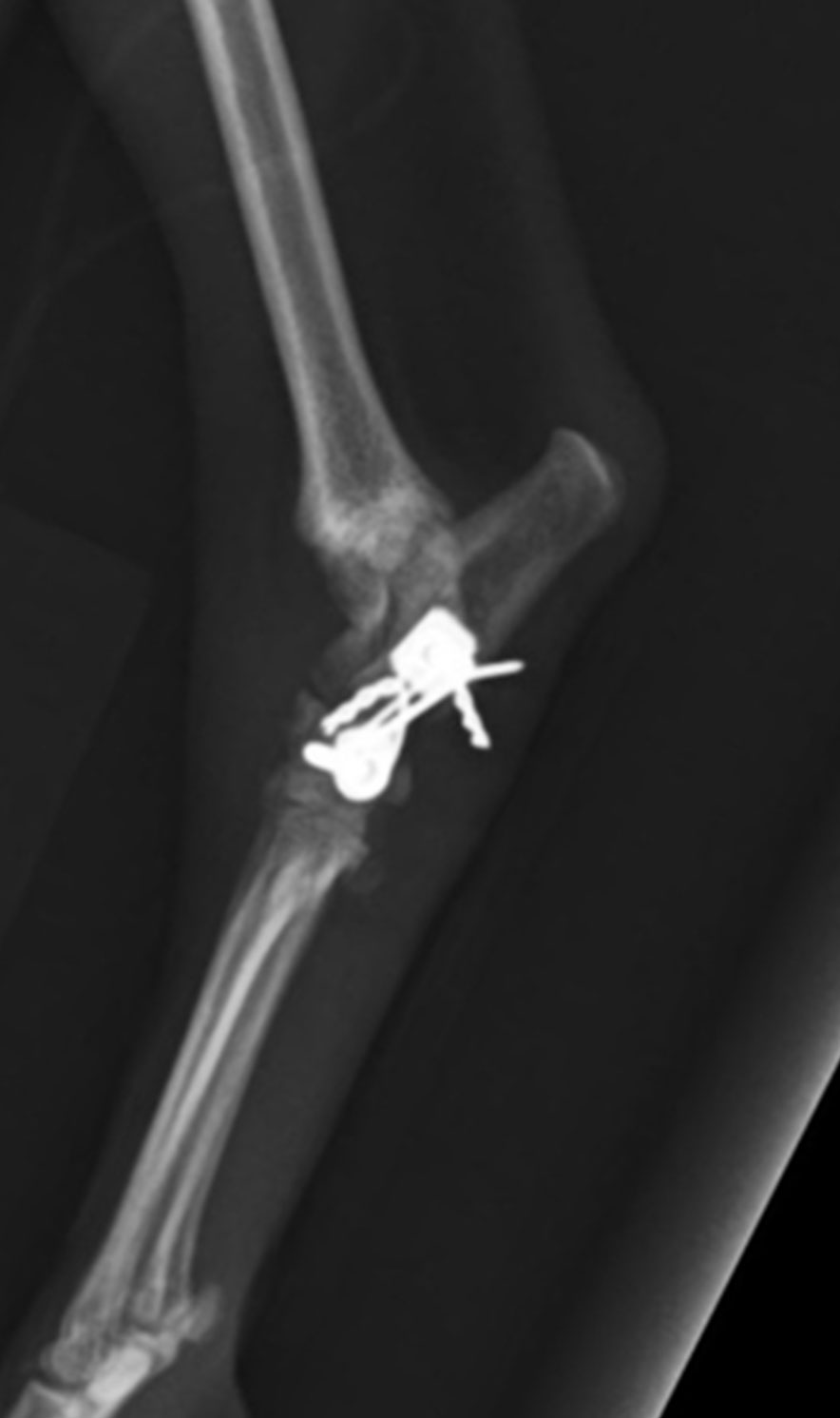 手術は観血的に骨の変位を整復し、プレートとスクリューで内固定しております。この症例ではSynthesのプレート(LCP1.5)とスクリュー(コーテックスクリューとロッキングスクリュー)をハイブリットで使用しております。